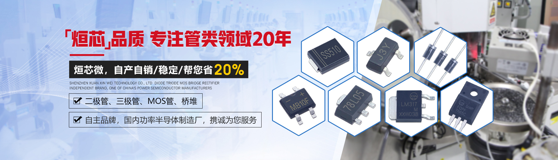 烜芯微科技建廠二十年 專業生產優質二極管、三極管、MOS管、橋堆等